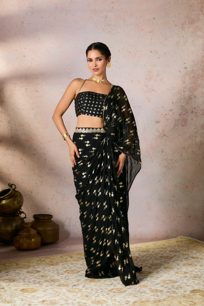 Using the saree in combination with crop top or even a shaped shirt in celebration wear.