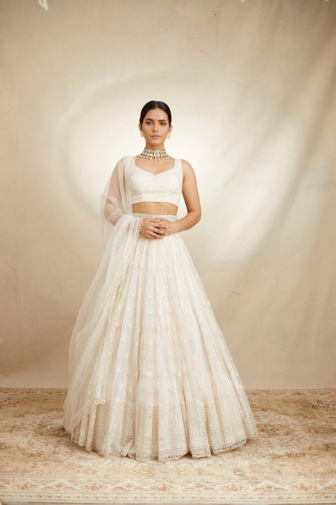 Weddings in the daytime should have lighter colors. Floral embroidered pastel lehengas are always going to look good. Choose a Ruchika Hurria wedding lehenga in blush pink, sage green, or powder blue. To make it soft and romantic, pair it with jewellery of pearls.