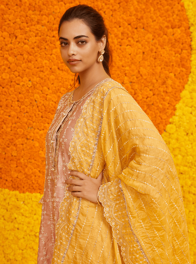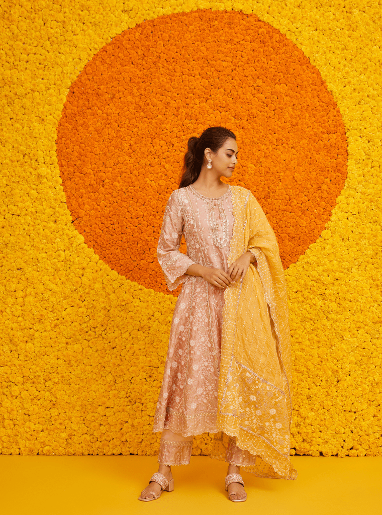 The sharp suits are back and here to stay! Such a perfect festive statement is made by the flow-y, flared pants that are worn with a short kurta and dupatta.